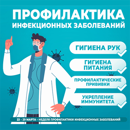 23 – 29 марта: неделя профилактики инфекционных заболеваний (в честь Всемирного дня борьбы против туберкулеза)Инфекционные заболевания возникают при воздействии болезнетворных микроорганизмов на восприимчивый к ним организм и могут передаваться от зараженного человека здоровому.